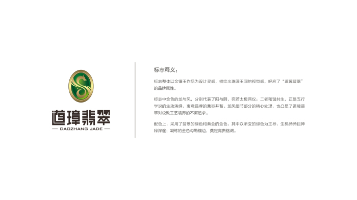 佛山道璋翡翠有限公司项目类型:LOGO设计项目描述:人玉合一,比德如玉,标志上下左右近乎全对称,十全十美,上下左右近乎全对称的美学设计,蕴藏平衡、稳定的中庸智慧之美。中英文字结合,寓意道璋翡翠的国际化时尚潮流。